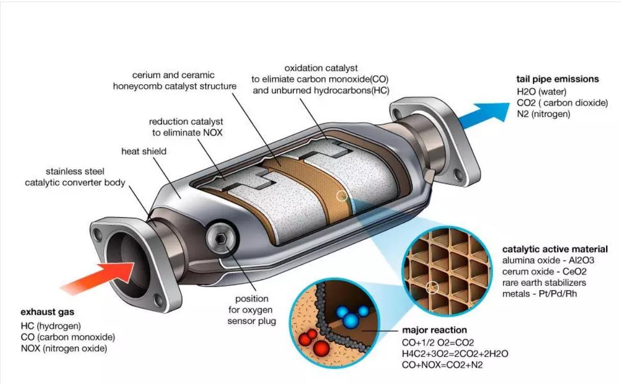 - In the first stage, the gases encounter a filter-type element with tiny honeycomb-like passages. The “filter” substrate is made of ceramic and is coated with “precious metals” (Rhodium, Platinum and/or Palladium).